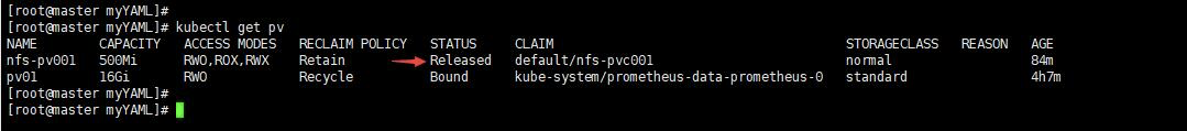 当我们删除那个PVC的时候,该PV变成Released状态,由于我们的策略是Retain,所以如果想让这个PV变为可用我们就需要手动清理数据并删除这个PV。这里你可能会觉得矛盾,你让这个PV变为可用,为什么还要删除这个PV呢?其实所谓可用就是删除这个PV然后建立一个同名的。