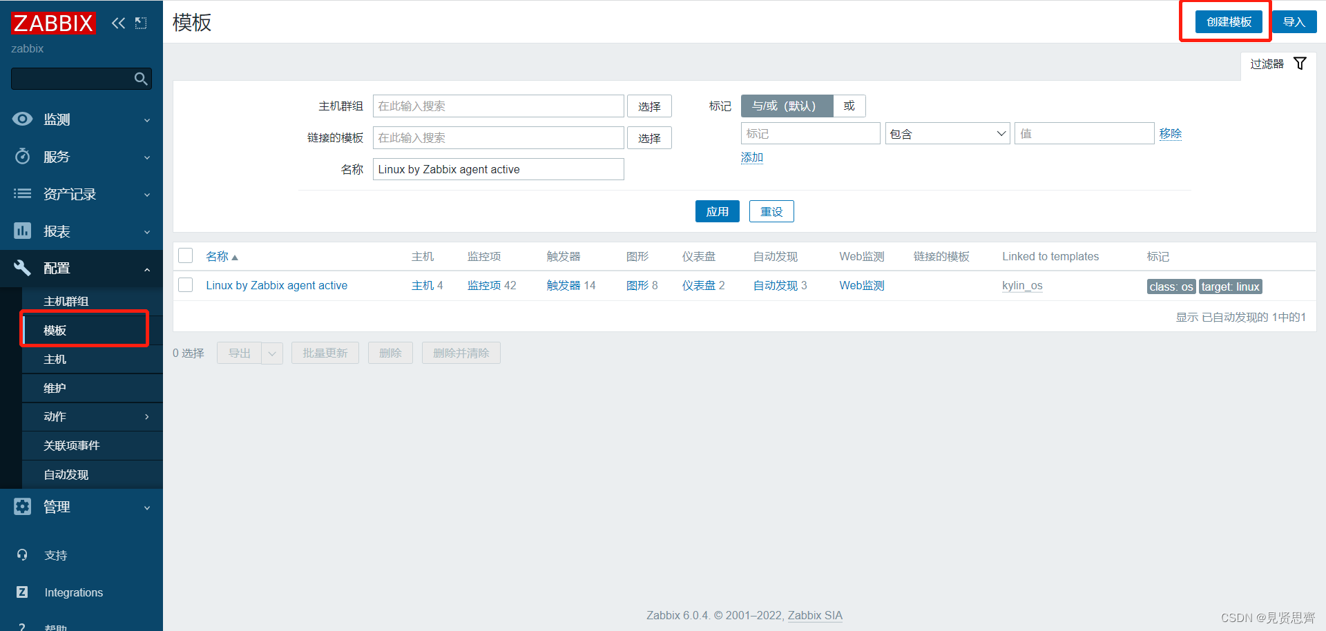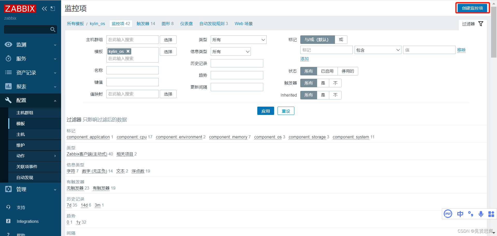为了记录在实际工作中新建的kylin_os监控模板,在添加监控项之前先做了kylin_os模板,银河麒麟V10 sp1系统的基本数据都可以通过Linux by Zabbix agent active模板获取,所以制作kylin_os是先继承了linux的模板,命名为kylin_os,然后在新的kylin_os模板监控项上新建需要的监控项。