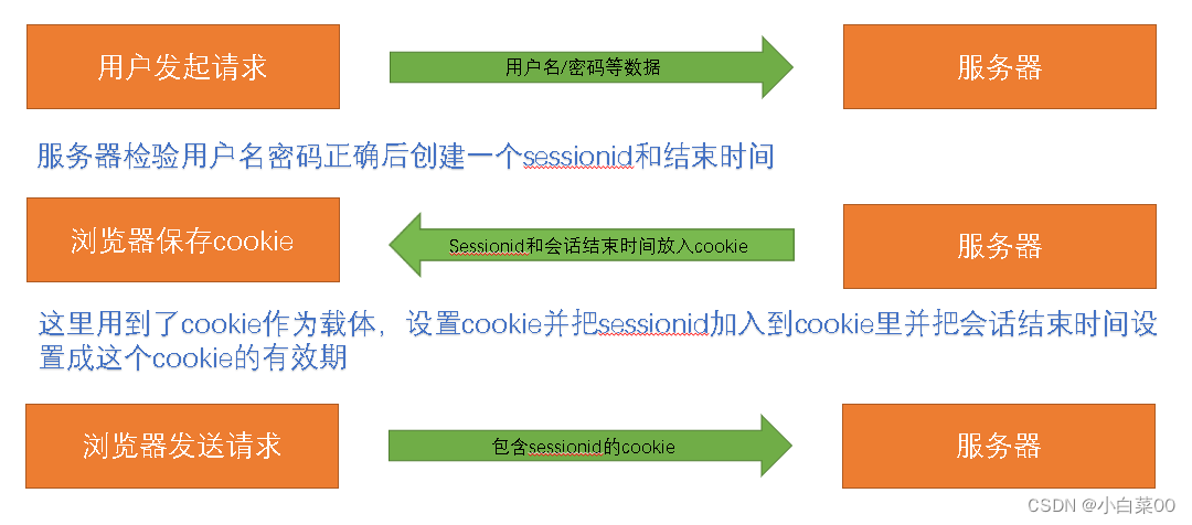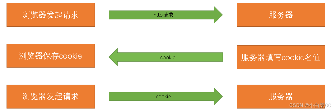理解:浏览器发起http请求,服务器会进行cookie设置也就是setcookie。cookie里有名和值两种属性,服务器会把名和值里的内容给填充完整然后将其发给浏览器,之后浏览器会保存起来,这样浏览器以后发送的每一个请求都会自动附上这个cookie