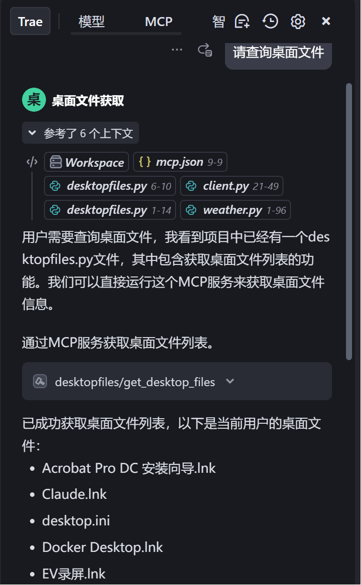 MCP服务实现功能:获取当前电脑的桌面文件。流程如下: