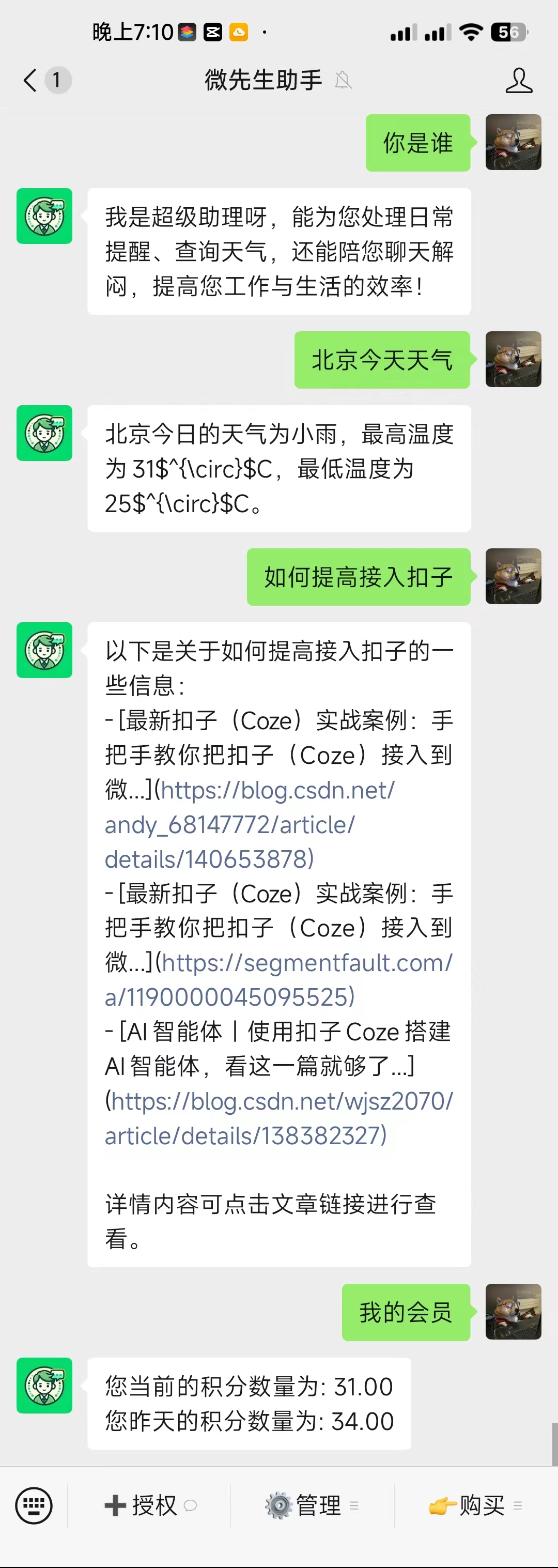 通过【微先生助手】接入扣子的好处如下:可集成微先生助手的每日签到领取积分、积分兑换码、限制粉丝回复次数、会员插件等功能来实现粉丝运营。