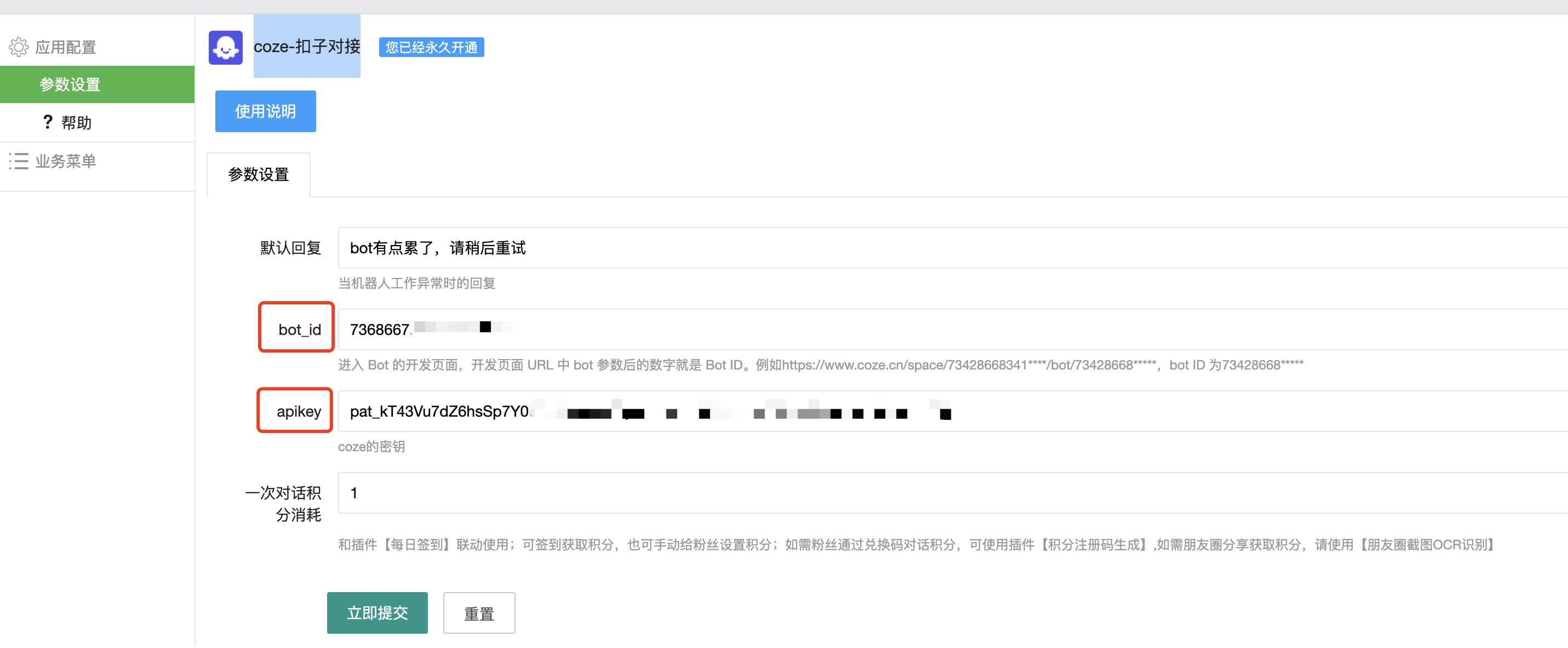 最后在【coze-扣子对接】如下配置了一次对话积分消耗1
