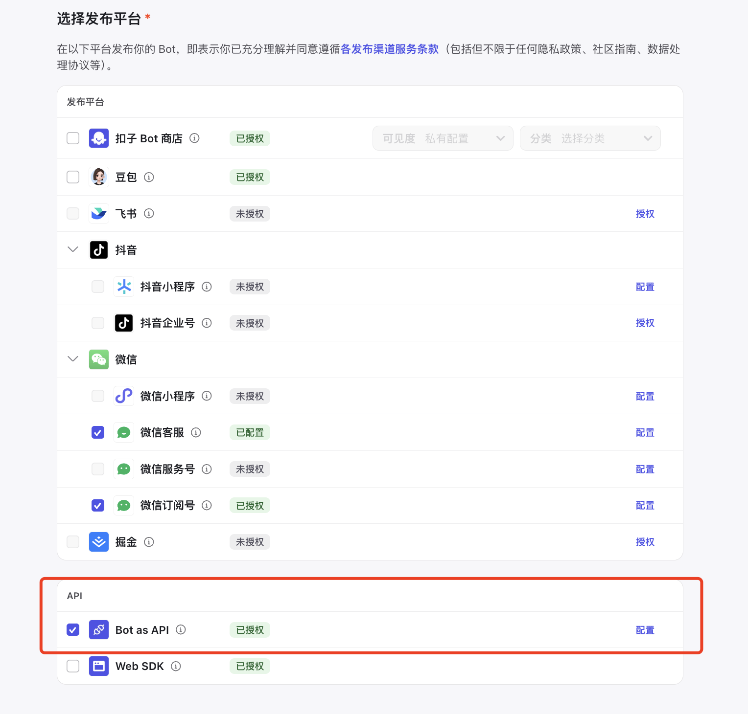 这里的发布平台勾选 Bot as API,如图所示