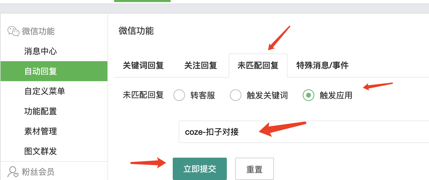 最后配置【微先生助手】的未匹配回复触发【coze-扣子对接】,就大功搞成了!