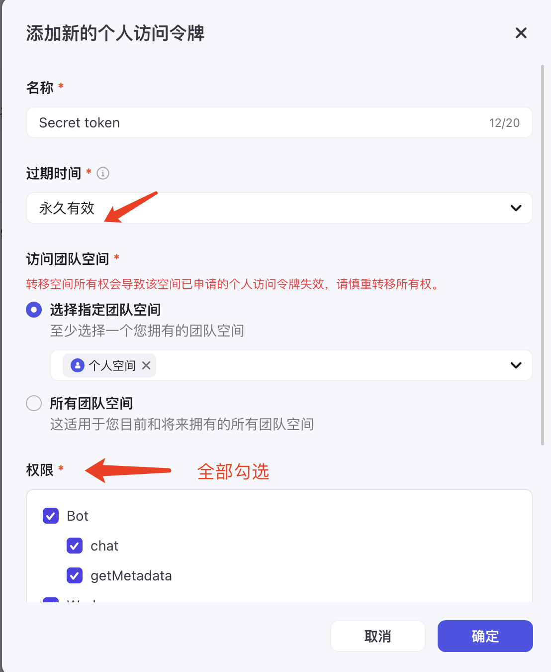 这里的过期时间选择永久有效,指定团队空间如图,权限全部勾选