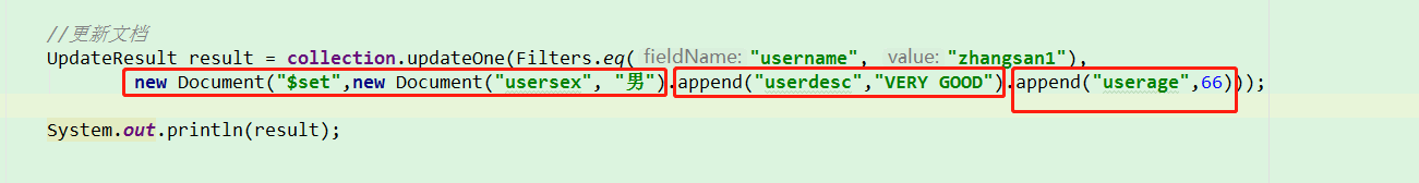 UpdateResult result = collection.updateOne(Filters.eq("username", "zhangsan1"),new Document("$set",new Document("usersex", "男").append("userdesc","VERY GOOD")).append("userage",66));