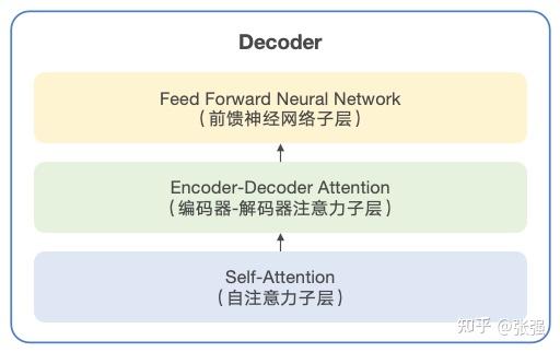 好了,花了一些篇幅介绍注意力机制,我们回来继续看 Transformer 的架构。打开 Decoder,同样包括“自注意力层”和“前馈神经网络层”。有所不同的是,在这两层之间,还有一个“Encoder-Decoder Attention Layer(编码器-解码器注意力层)”。