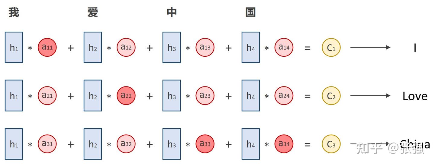 上图深红色表示注意力得分较高,浅红色表示注意力得分较低,Encoder 输出的 、、C1、C2、C3 各不相同。而且,在输出第 1 个单词“I”的时候和输入的“我”的相关性最高,和其他词的相关性比较小;输出第 3 个单词“China”的时候和输入的“中”和“国”相关性最高,和其他词的相关性比较小。相关性越大,对输出的影响越大,自然应该分配更多的关注度;反之,相关性越小,对输出的影响越小,自然就应减少对其的关注多。这和人类在处理信息时的思路是趋同的。这就是 Attention 机制的宏观理解。