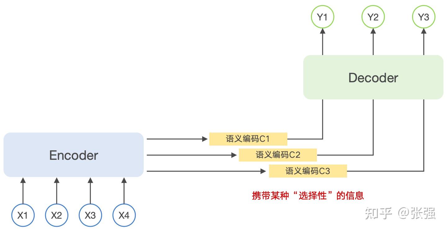 从这张图能够看到,在 Attention 机制下,Decoder 输出 Y1、Y2、Y3 每个词所基于的语义编码信息,即上下文信息都是不同的,可以简单表示为以下的公式: