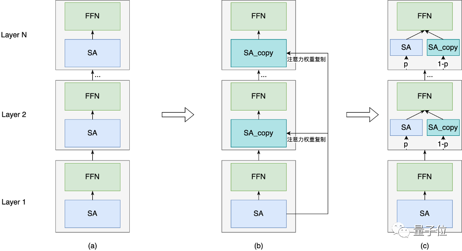 解决方案:我们发现Attention Weights在不同层之间的差异性不大。一个直接的想法是只在第一层计算Attention Weights,在其它层复用这些值,那么整个模型Attention Weights的计算复杂度降低为原来的1/N,如下图(b)所示。但是,通过实验发现,这种方法对效果是有损失的。因此我们对模型做了进一步改进,在每一层我们随机掷骰子,有p的概率重新计算Attention Weights,1-p的概率复用上一层的Attention Weights。通过实验发现,当p设置为50%,模型效果无损,Attention Weights总的时间复杂度降低50%。