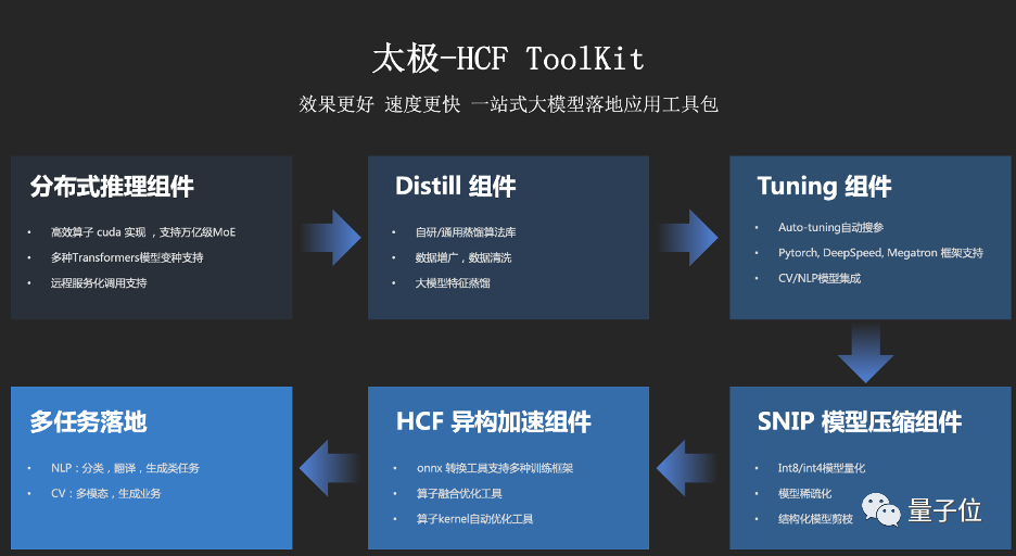 为此腾讯推出了太极-HCF ToolKit,它包含了从模型蒸馏、压缩量化到模型加速的完整能力。