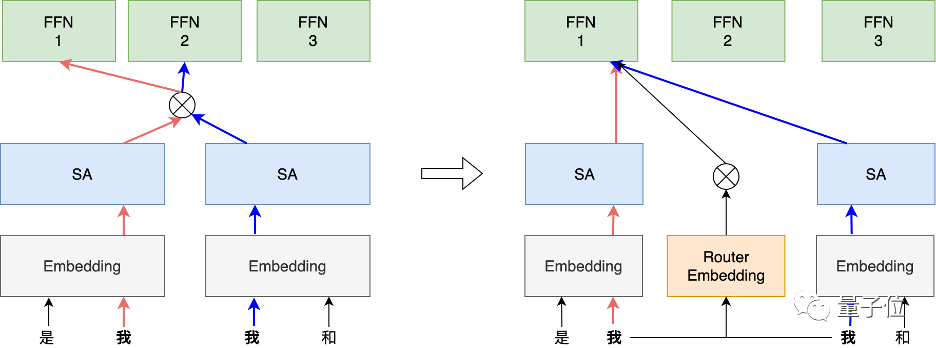 挑战描述,原来的Routing方法以Self-Attention的输出作为输入,有几个缺点:首先路由和词本身的关联随着SA对信息的加工逐渐变弱。其次不同层之间的Self-Attention输出差异很大,路由的稳定性比较差。如下图(左),对于相同的词“我”,路由分配到不同的专家(专家1和专家2)。