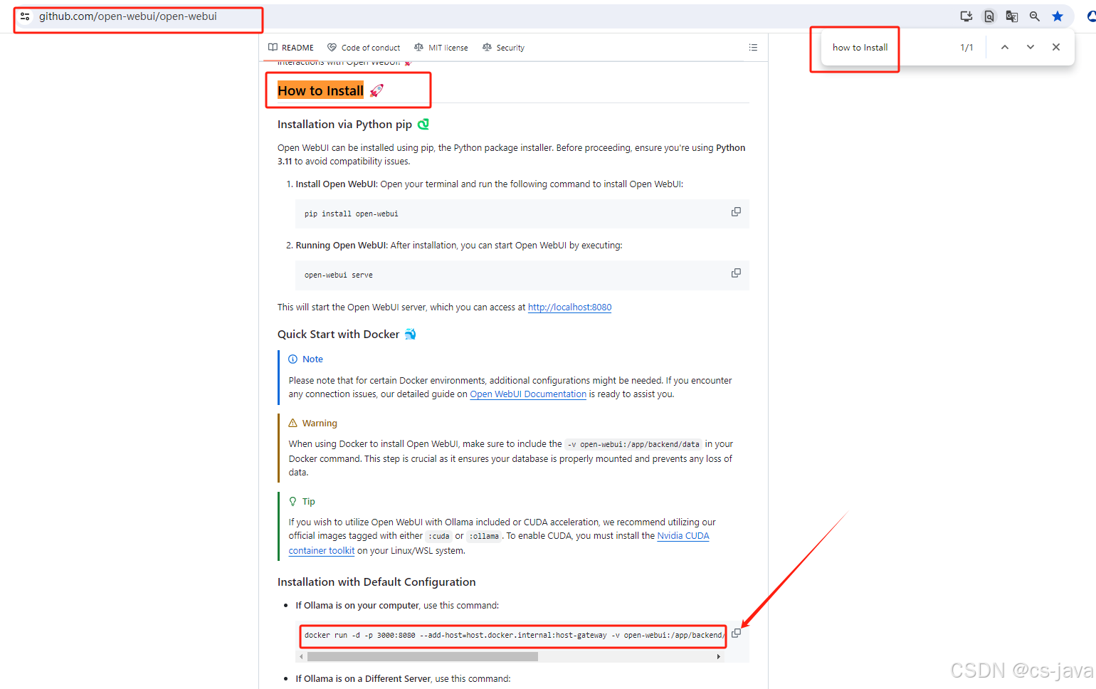 5.3 找到open-webui的项目代码,官网:https://github.com/open-webui/open-webui 网页搜索how to Install,然后往下一点,找到如图的命令:点击复制