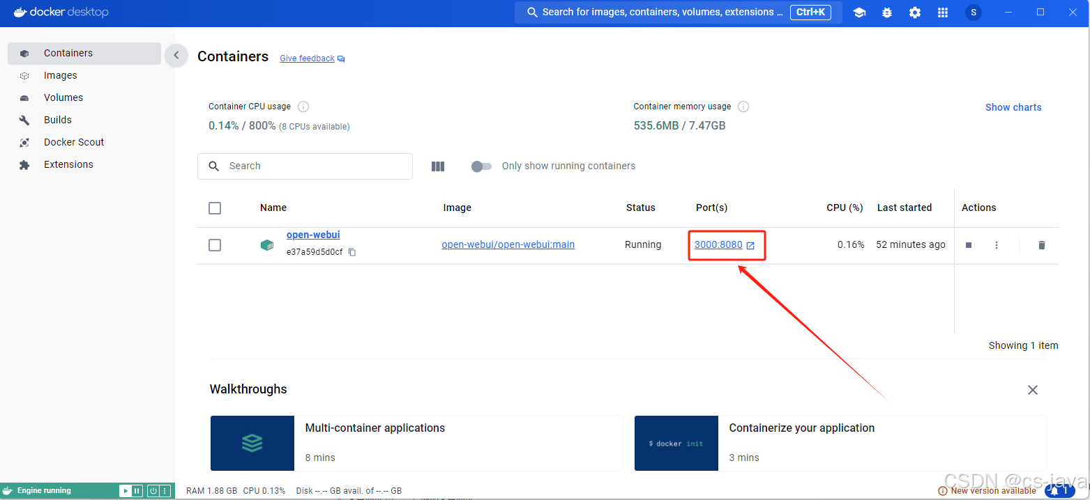5.5 等它全部下载complete后,打开docker的控制台,如图点击3000端口即可: