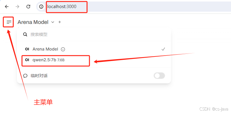 6.1 你先选择你自己的安装的大模型,如图,然后点击左上角 主菜单