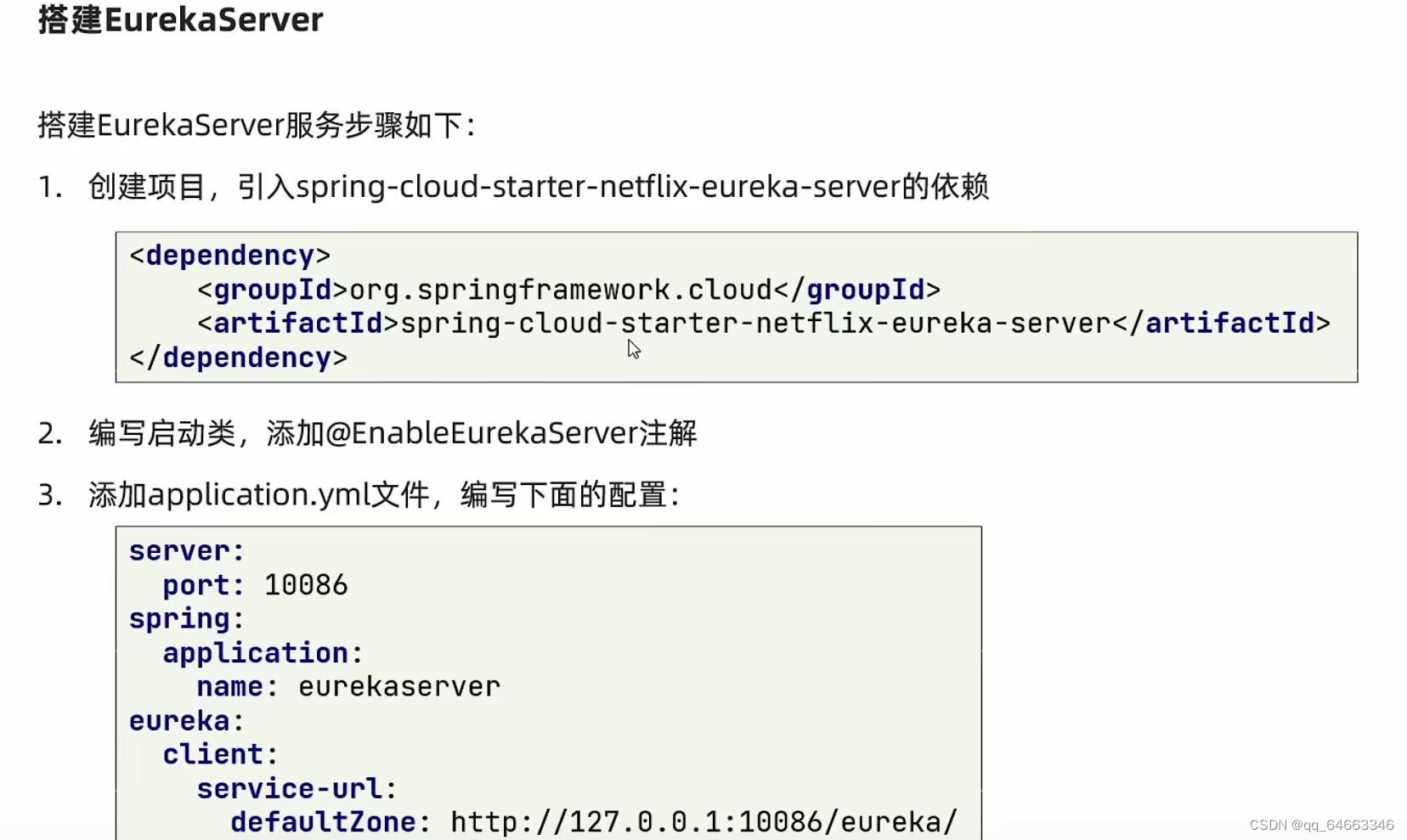 server: port: 10086 spring: application: name:eurekaserver # 服务名称 eureka: client: service-url: defaultZone: http://localhost:10086/eureka # 地址信息