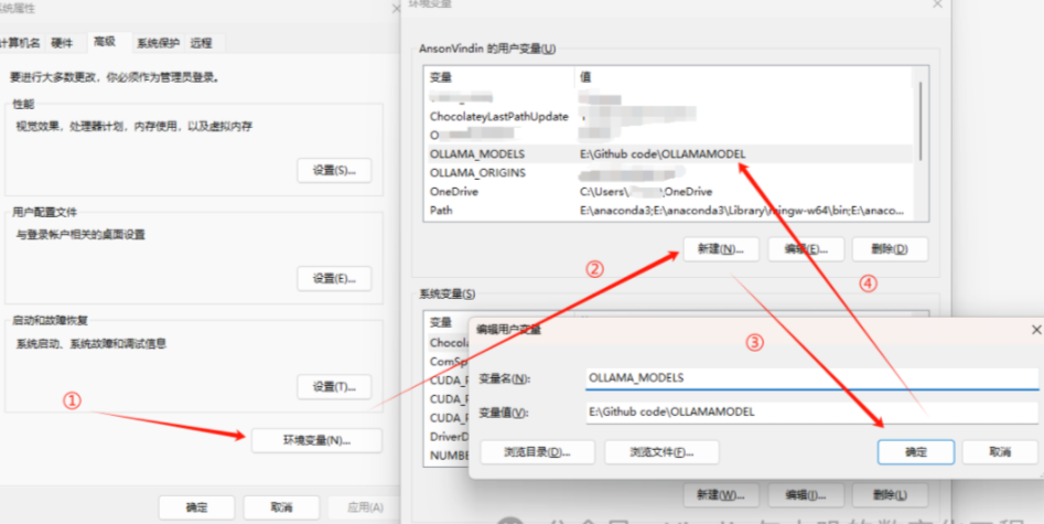 (你想要存放大语言模型的路径,举例说明:我想把模型存放在E盘Github code文件夹下的OLLAMAMODEL这个文件夹中,那么变量值就输入如下)