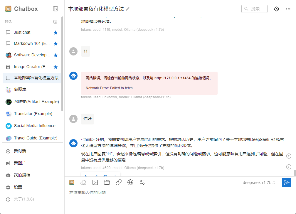 使用本地部署的DeepSeek-R1模型提出问题,观察其响应效果。