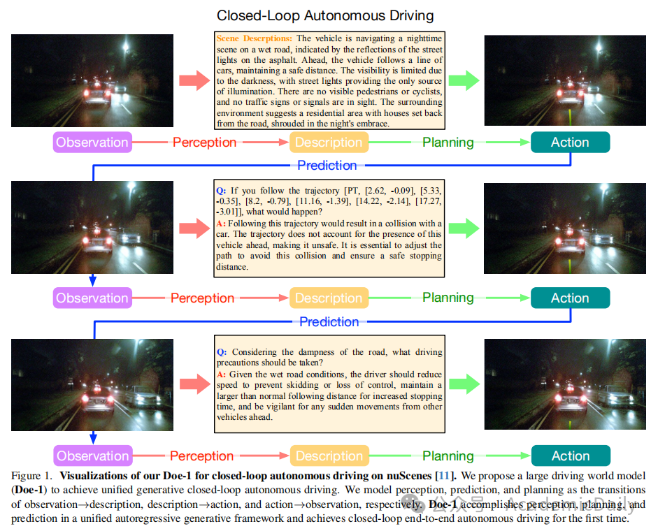 为了改进这一点,Doe-1采用了一种闭环的方法,将感知、预测和规划视为一个连续的过程,即从观察到描述,再从描述到行动,最后由行动反馈到新的观察。