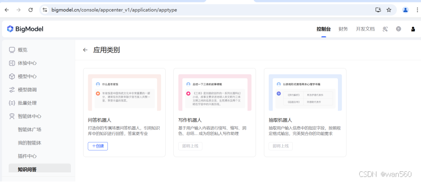创建的应用分两类:自主规划agent和工作流agent。不知道这里为什么要强调agent,所以为什么之前我说和agentBuilder界限不清晰,有百度云的同学看到也欢迎答疑一下。