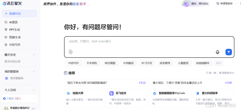 https://xinghuo.xfyun.cn/。明显语音是强项,语音方面的功能会多些(比如选发音人)。略复杂的文生图效果也不好。