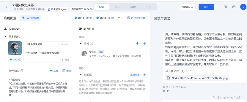 和前面的也差不多,能自动生成智能体,图生文不需要集成插件,直接大模型就输出了。和千帆需要使用Text2Image插件不一样,虽然千帆也支持StableDiffusion开源模型,但是appbuilder上不能直接选,modelbuilder上是可以体验的(下期再说)。