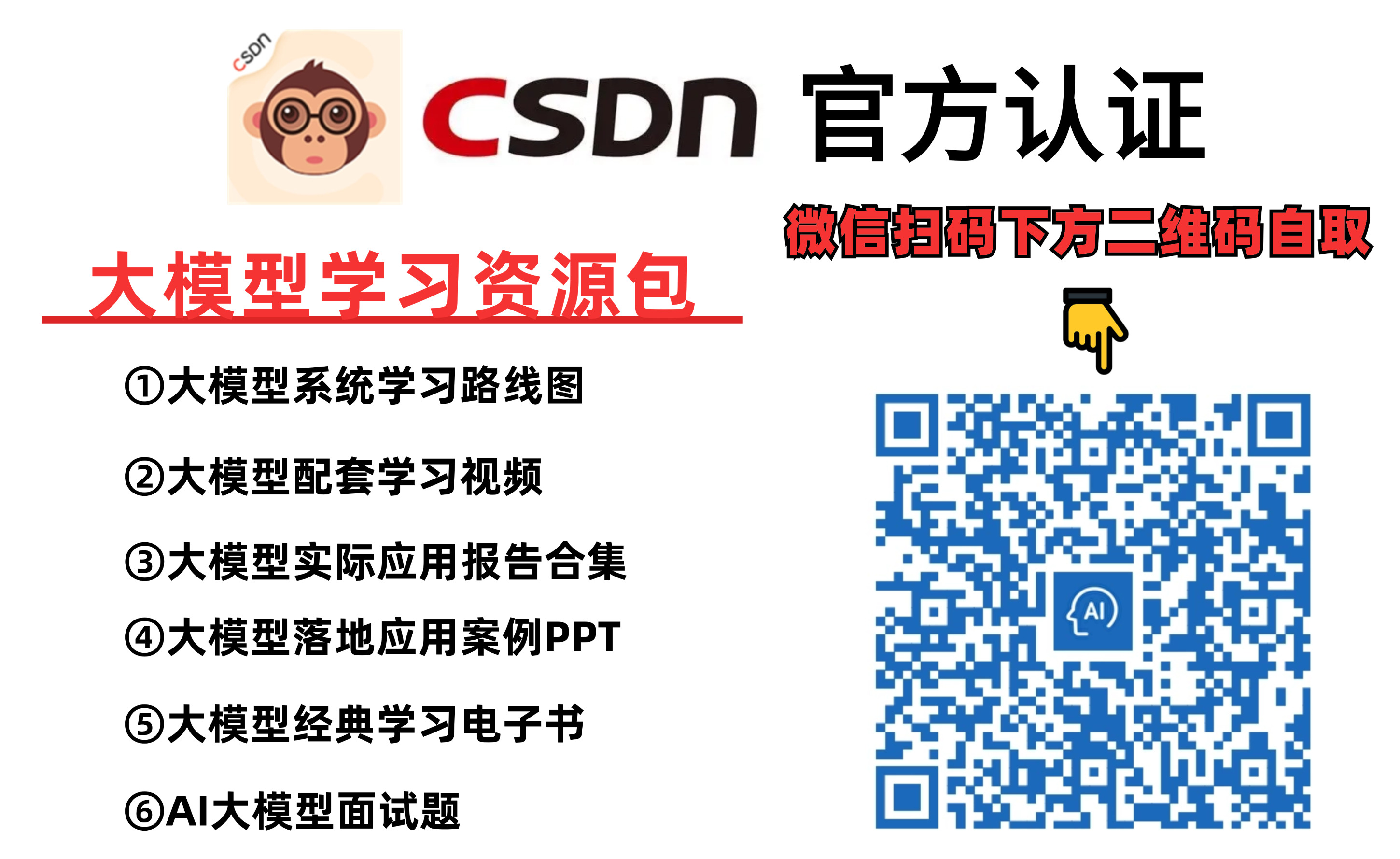 这份完整版的大模型 AI 学习资料已经上传CSDN,朋友们如果需要可以微信扫描下方CSDN官方认证二维码免费领取【保证100%免费】
