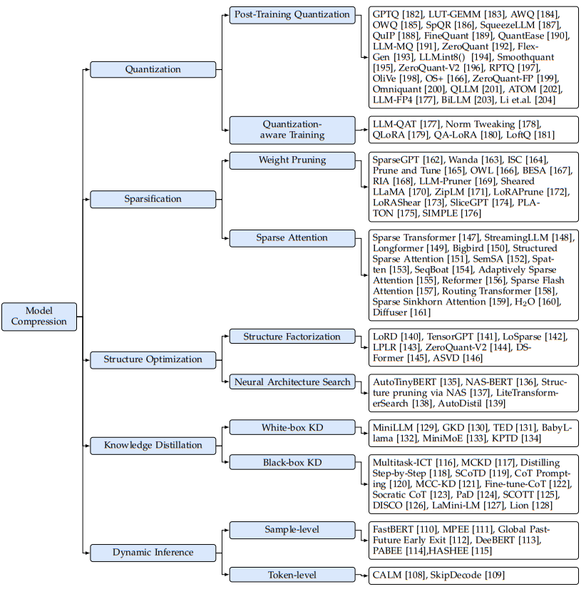 - 模型级别优化:即在模型推理时,通过设计一个有效的模型结构(如有效的结构设计)或者压缩预训练模型(如模型压缩)来优化推理效率。优化第一种优化通常需要昂贵的预训练或少量的微调来保留或者恢复模型能力的成本,而第二种典型的会给模型性能带来损失。