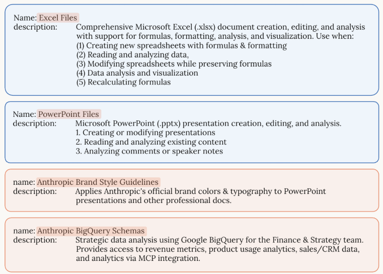 llm会一开始就把这个元数据加载到system prompt里。llm只知道每个skill存在在这,以及什么时候去使用它。