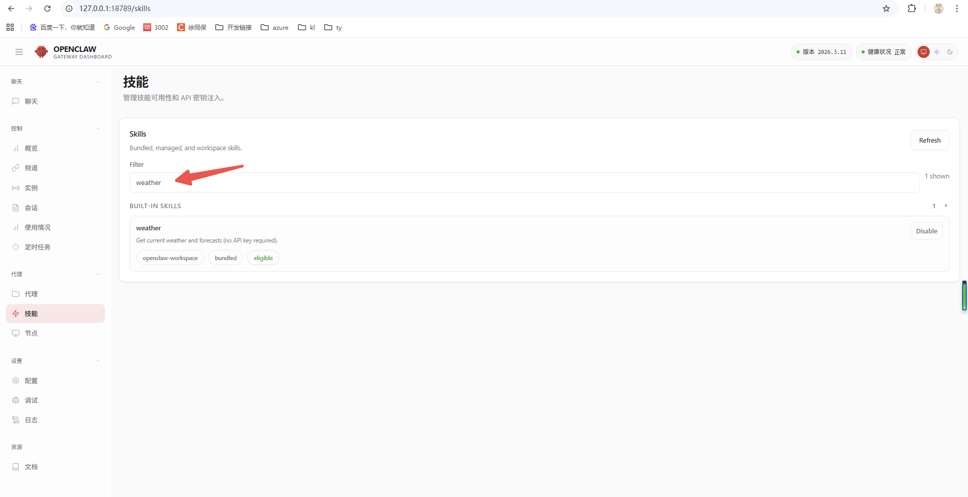 openclaw使用clawhub安装skills,测试安装weather,可以查询天气的一个skills